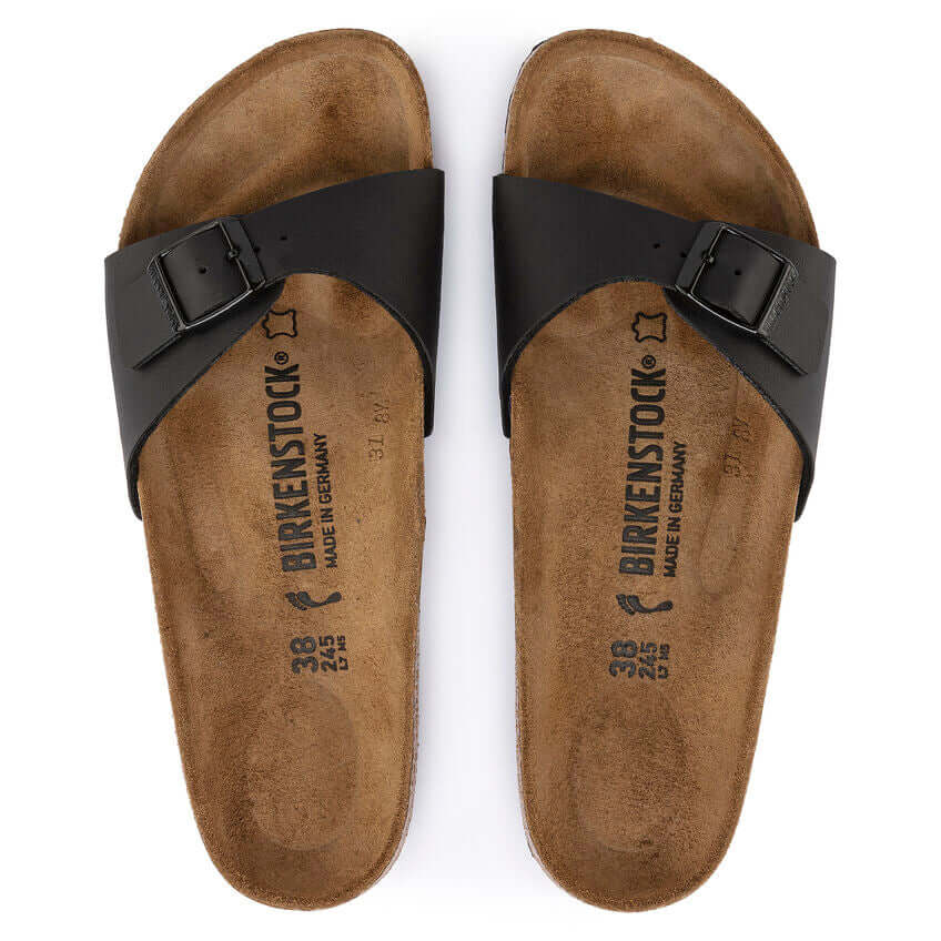 The original BIRKENSTOCK Sandal. A strap, a buckle, and a contoured cork footbed are masterfully combined to create the Madrid. The upper is made from the skin-friendly, hard-wearing synthetic material Birko-Flor®.