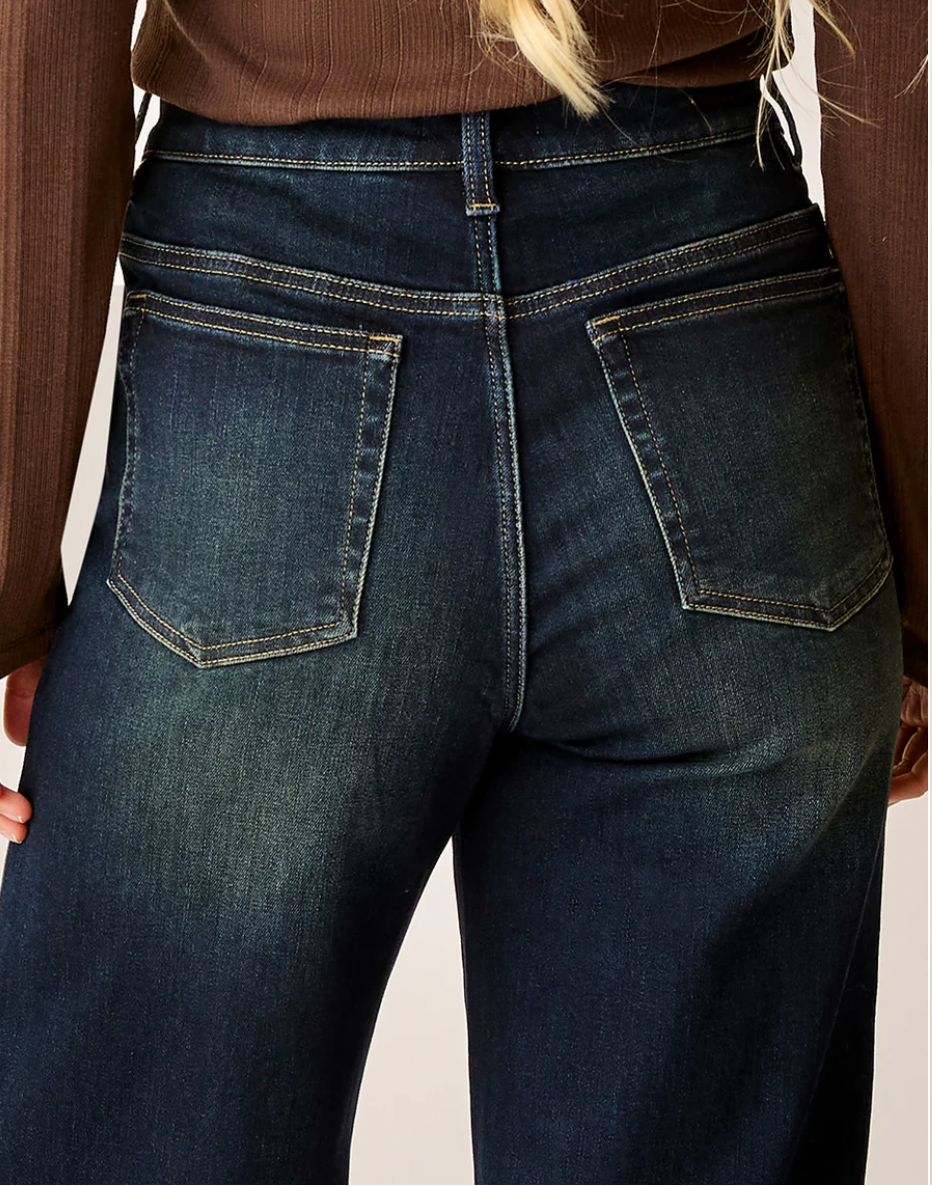 Victoria Twilight Stretch Denim, zipper fly with button closure and full length fit provide backup to an otherwise showstopper. Longer length inseam. A high rise that is fitted at the waist and hip and relaxes into a slouchy straight leg.