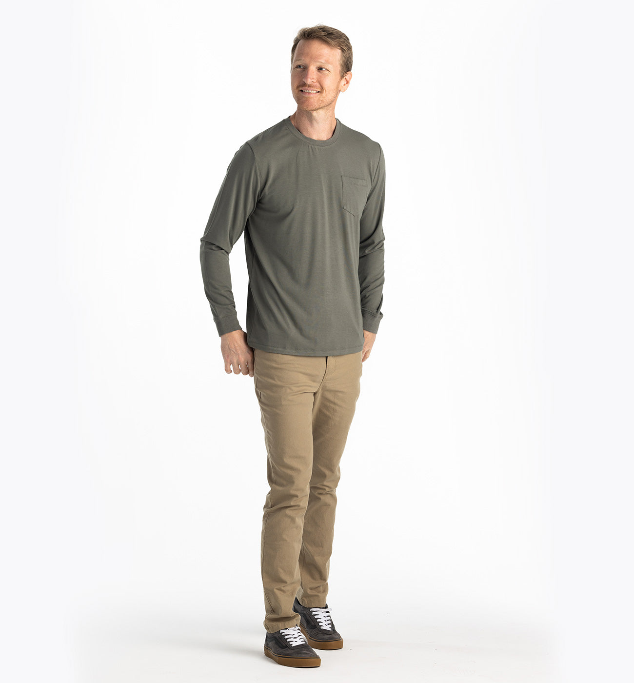 Free Fly's Flex fabric might be from the future. With a luxe, weighty drape, mind-blowing softness, and a laundry list of performance benefits like temperature regulation, UPF 50, and four-way stretch? Yeah, definitely from the future. The Bamboo Flex Long Sleeve Pocket Tee is an upgraded take on a wardrobe classic, with a next-level quality you can feel. Easy, handsome, and layers like nobody’s business—this long sleeve t-shirt pairs perfectly with everything in your cool-wardrobe.