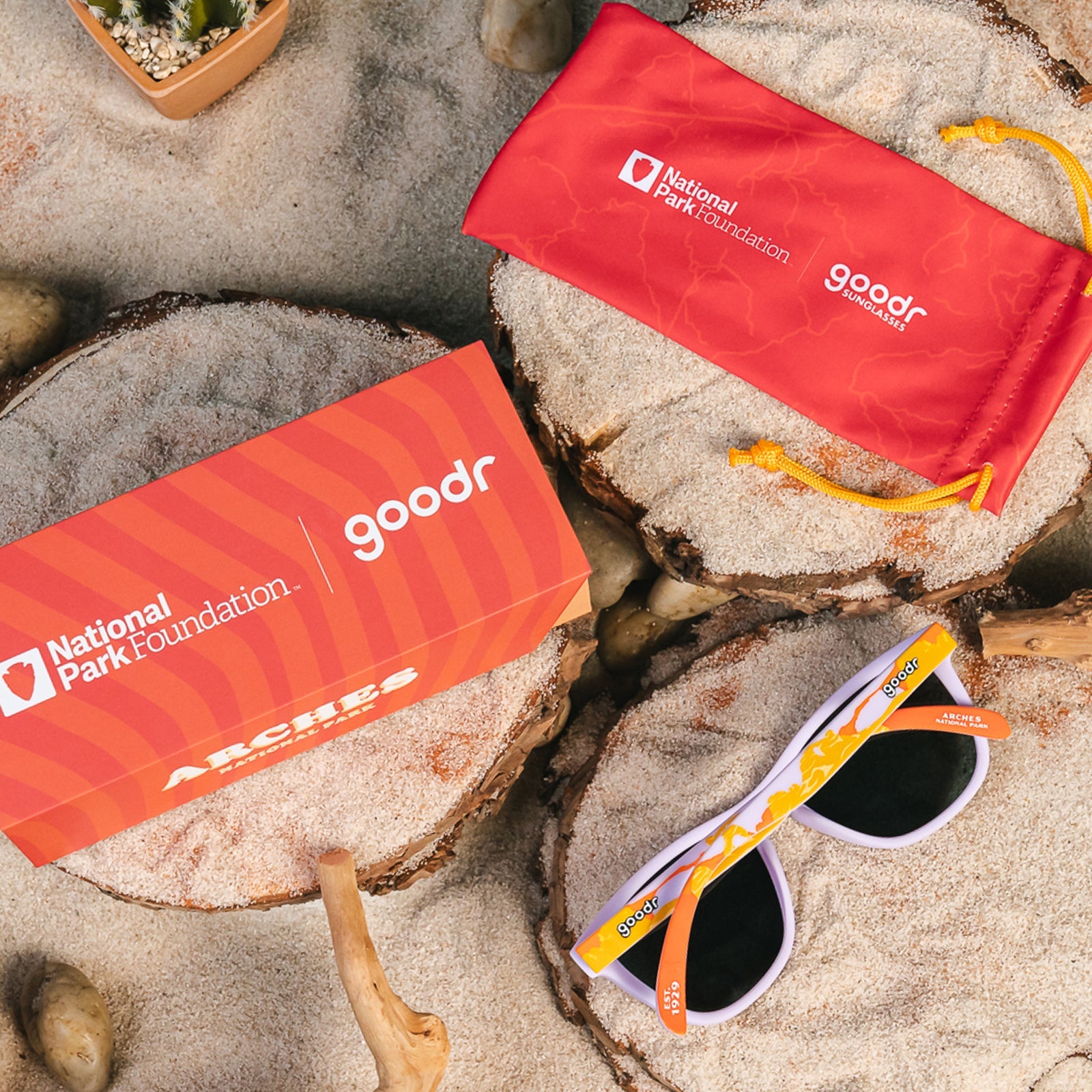 Arches National Park has more than 2,000 natural stone arches. These limited-edition lavender sunglasses with amber reflective lenses feature an iconic landscape design inspired by this beautiful red-rock wonderland.