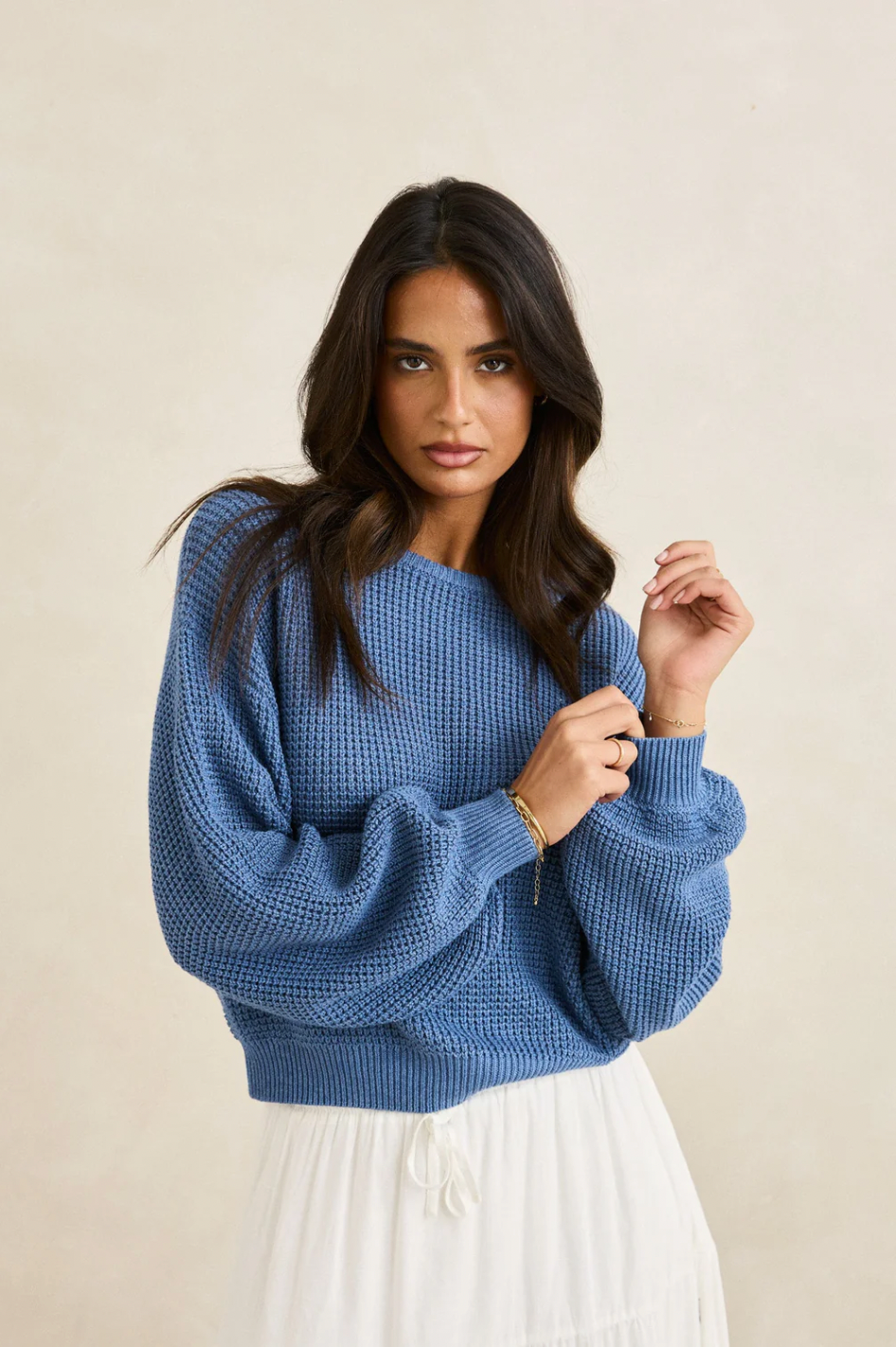 Wrap yourself in comfort with the Classic Knit Jumper in Steel Blue. Crafted from a mid-weight yarn with a soft hand feel, this relaxed crew neck jumper sits at the hip, offering a flattering fit. Balloon sleeves add a touch of whimsy, making it a stylish choice for chilly coastal evenings or cozy gatherings.