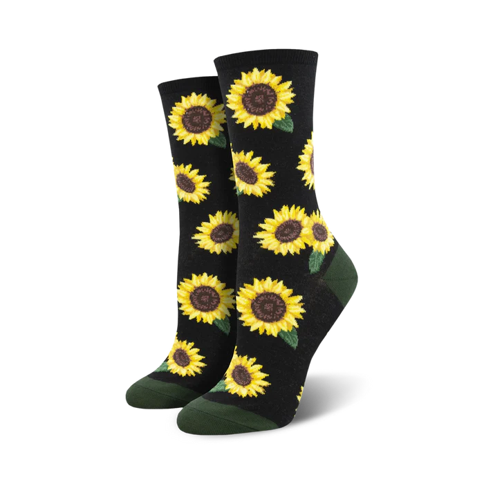 More Blooming crew socks for women are bright, bold, and bursting with good vibes. Inspired by summer's favorite flower, these sunflower socks feature vibrant yellow and brown blooms with green leaves and a green toe and heel. They're the perfect socks to add a pop of color to any outfit, whether you're wearing them to a festival, a picnic, or just a day at the beach. And did you know that sunflowers are a symbol of happiness, positivity, and longevity? So why not put on a pair of More Blooming socks today and let your feet do the talking?