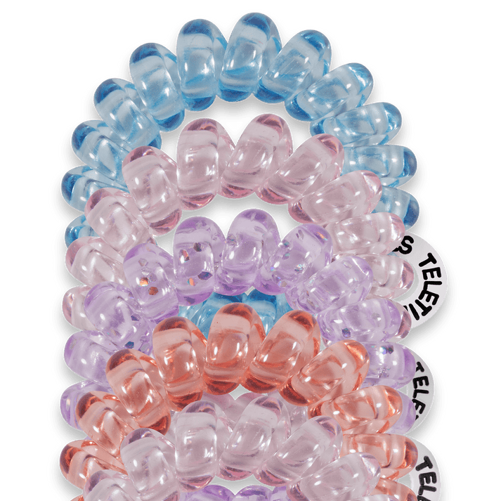 Sea Glass Tiny Hair Ties in clear pastels are the ultimate solution for securing braid ends, styling little kids' hair, or managing ultra-thin strands. These mini hair coils are designed to fit an adult finger like a ring rather than a bracelet, offering a strong, damage-free grip that keeps hair in place all day—without breakage, creases, or headaches.
