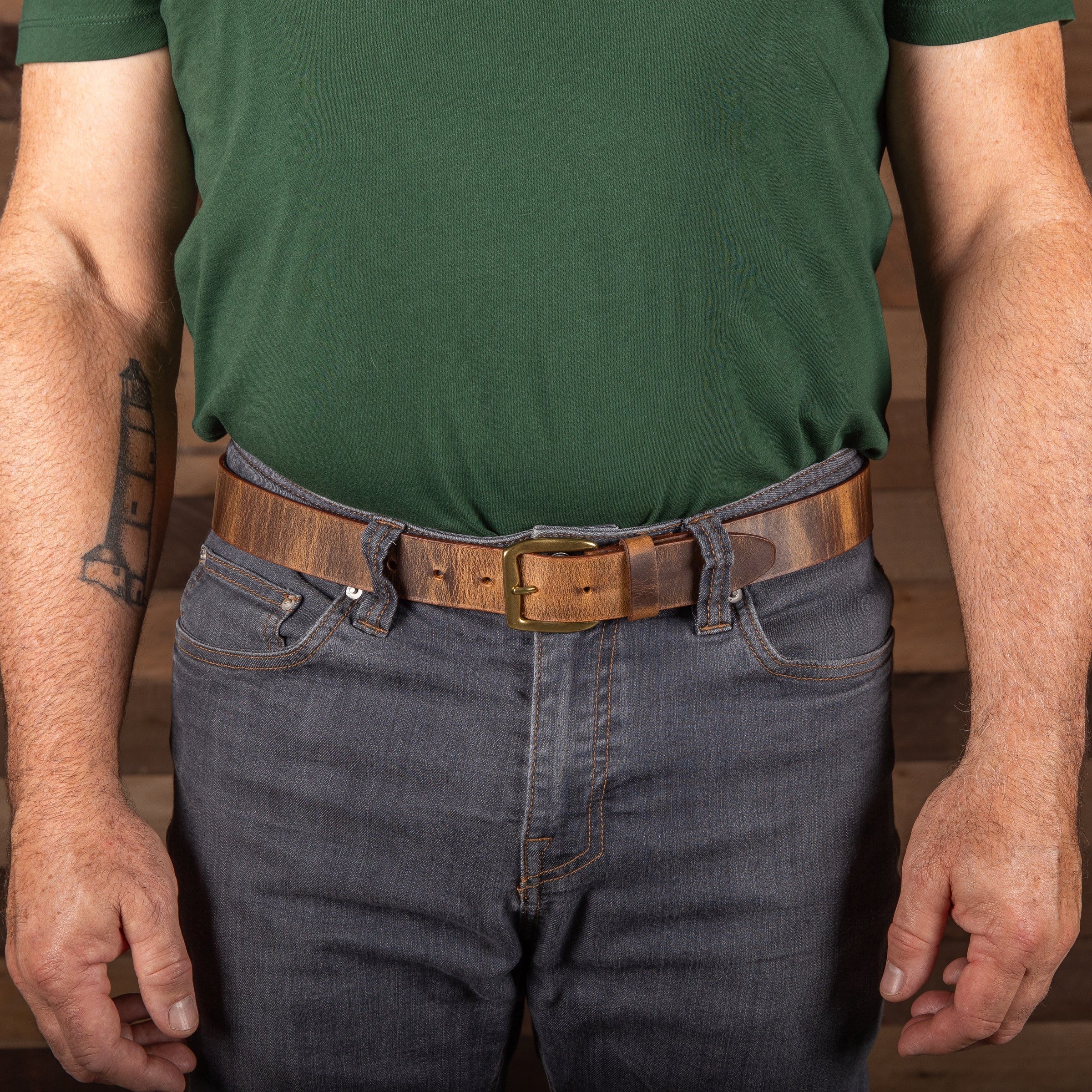 Folklore distressed leather belt is made using full grain pull up leather tanned with waxes and oils giving it a rich two-toned appearance when folded and creased. The subtle tonal shading of the leather only improves with use. Proudly made in Maine and shipped in Belted Cow Company drawstring gift bag.