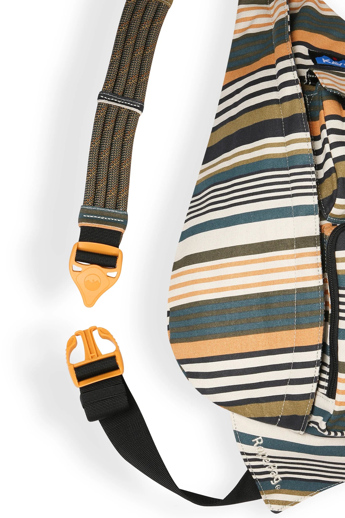 This cotton canvas sling features an adjustable rope shoulder strap with side release buckle, two vertical zip compartments, two key or cell phone pockets, and a padded back with KAVU embroidery.