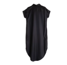 Relaxed fit dolman sleeve button up shirt dress, stand collar, 25% certified recycled polyester faux wood buttons, front on seam pockets, back yoke, deep curved hem, length hits mid-calf