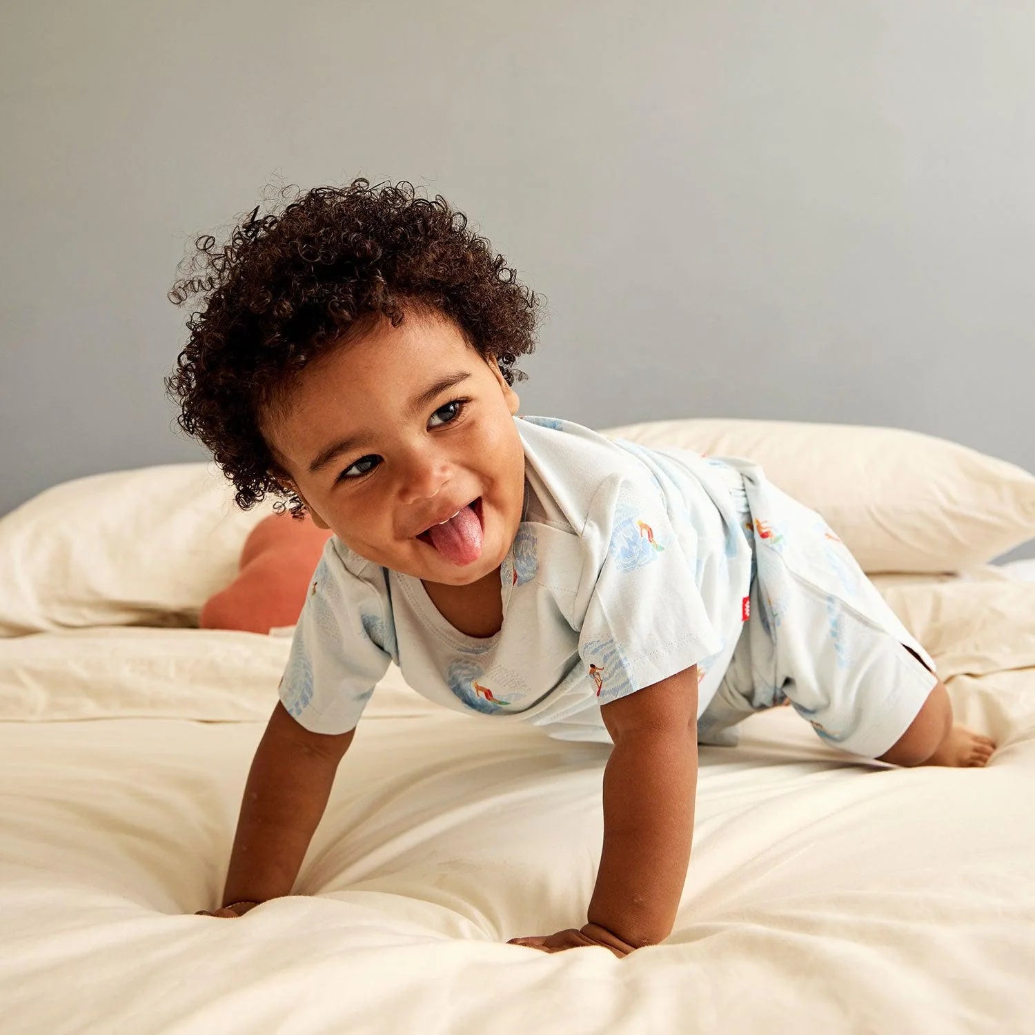 The no drama pajama shortie set comes complete with magnets at the neck so kids can dress themselves before bed. (Read: no over-the-head struggles.) It's made of our revolutionary RightFit™ fabric, the softest modal blend that brings a loose-fitting, comfortable fit kids expect in pajamas.