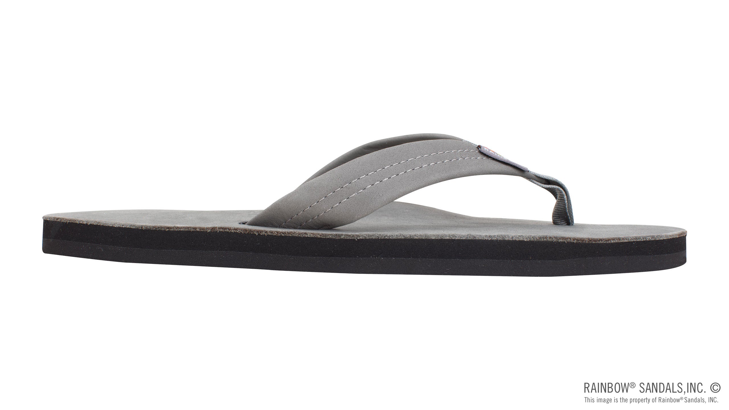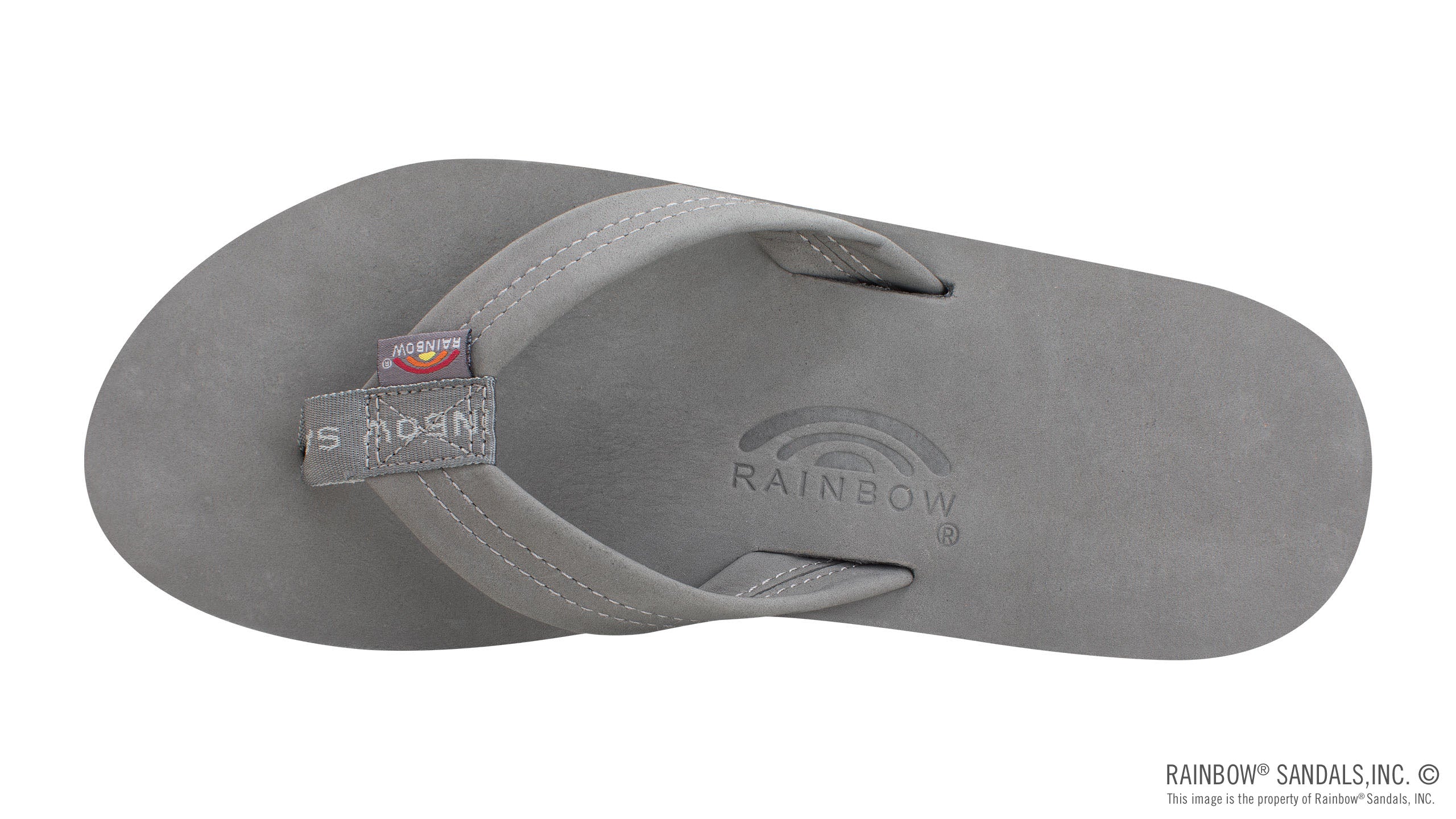The single layer premier leather sandal is made with top grade nubuck leather; the top sole is embossed with the Rainbow® logo. The strap, also nubuck leather; is double stitched, and the nylon toe piece is secured with a box X stitch, all using bonded nylon thread.