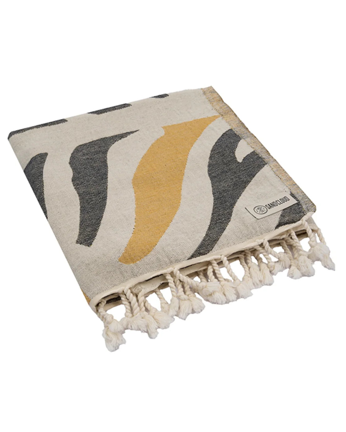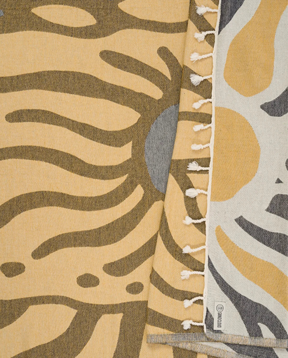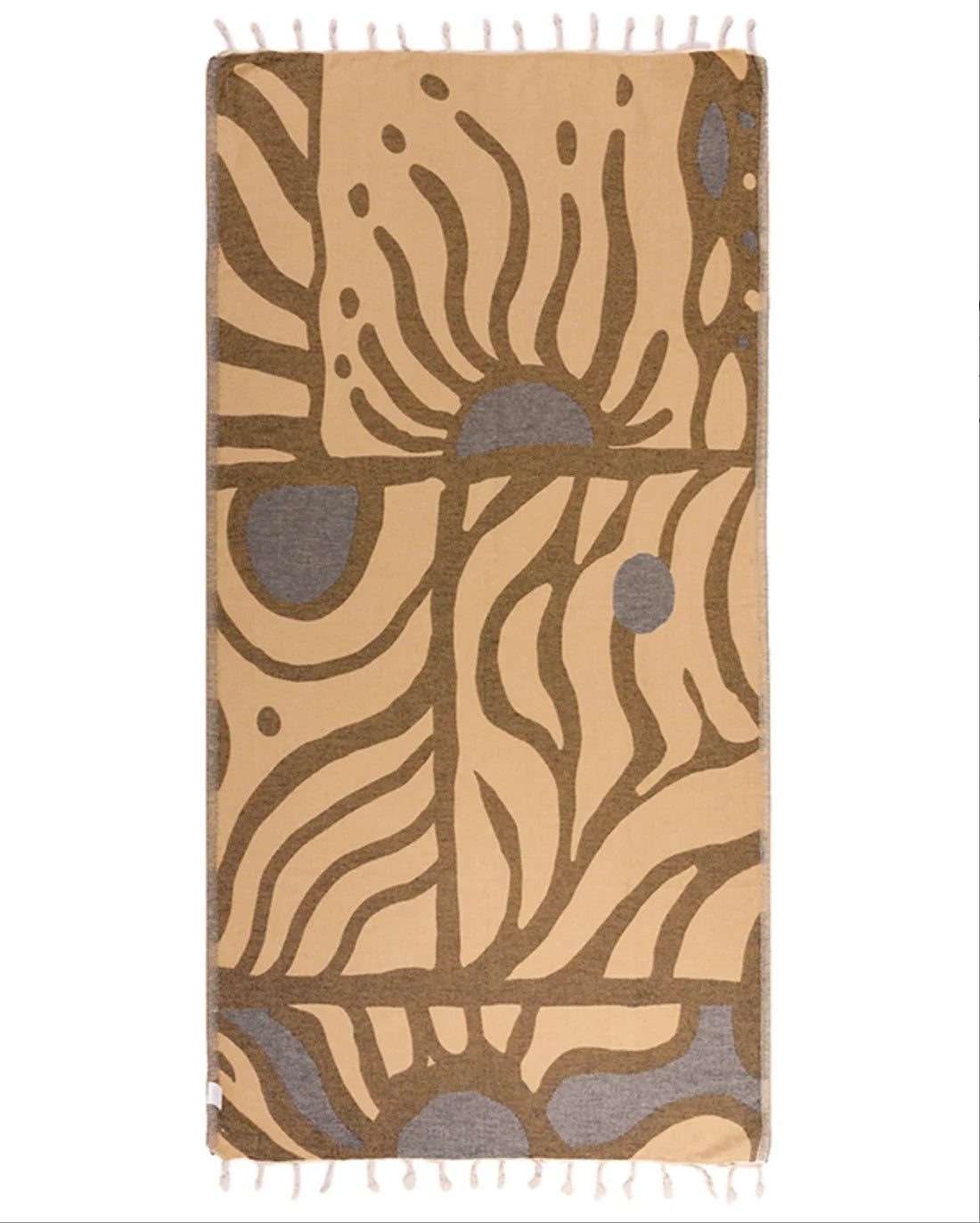 Sun Halo design, made from organic cotton for a softer hand feel and a better sustainable product, regular size, single jacquard weave, twisted tassels and sand resistant