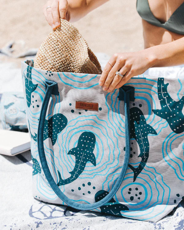 Meet your new catch-all companion, the Shark Ripples printed Beach Tote! Designed to hold all your essentials and then some, it's a statement piece, a reliable travel buddy, and a stylish accessory all rolled into one. Made in India from 100% Organic Cotton Canvas with 100% Recycled Poly Lining. Complete with a spacious interior featuring an interior zipper pocket, Interior sunglasses & cell phone pouch pockets. Featuring an exterior Sand Cloud vegan leather patch, it's your perfect partner for beach days and beyond.