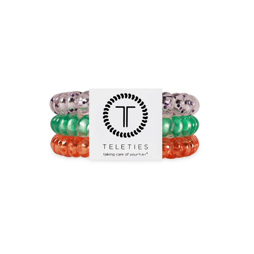 Showbiz Small Hair Ties in Orange and Teal offer a strong grip without damage, doubling as a chic wrist accessory when not in use. Your new favorite hair essentials all year round.