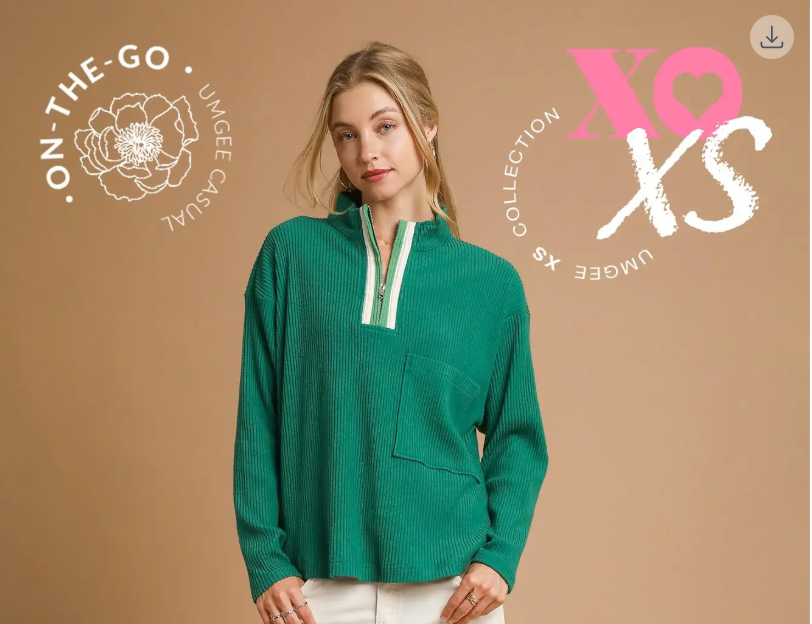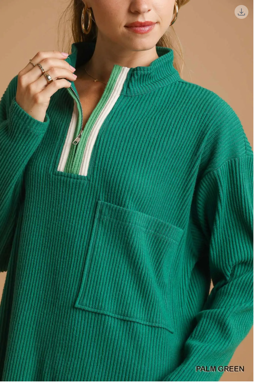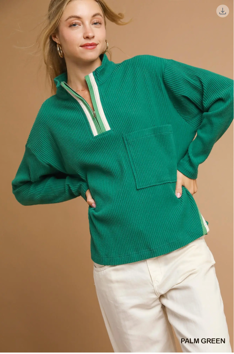 Umgee W Mock Neck Contrast Half Zip Pullover PALM